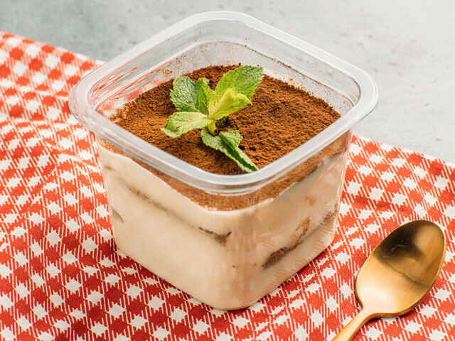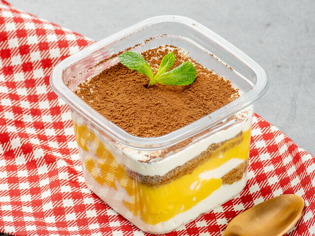 Сливочный сыр, печенье "Савоярди", кофе, мусс манго, какао.