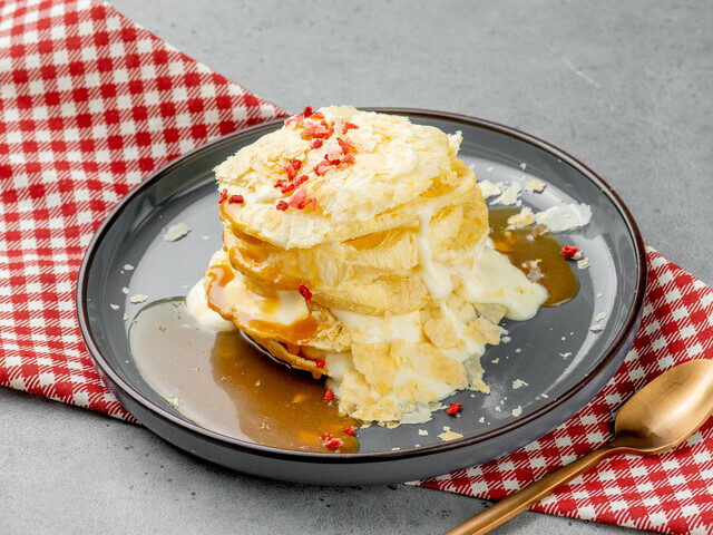 Слоёное тесто, пломбирный крем, солёная карамель.