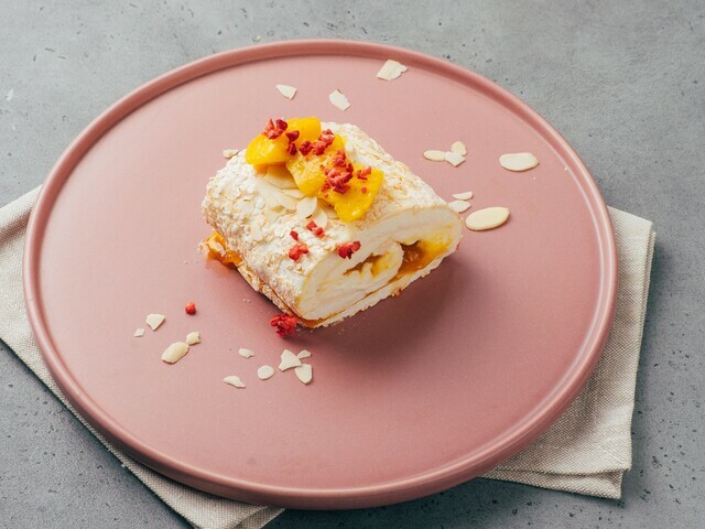 Рулет белковый, сыр творожный, сливки, сахар, пюре маракуйя, манго, лепестки миндаля, ягода сублимированная.