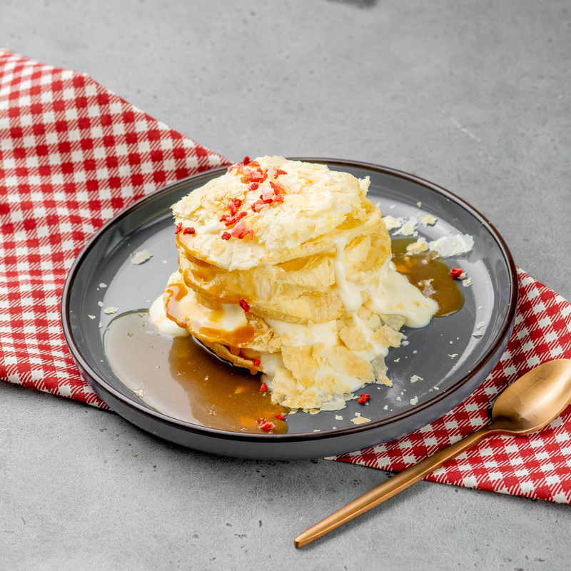 Слоёное тесто, пломбирный крем, солёная карамель.