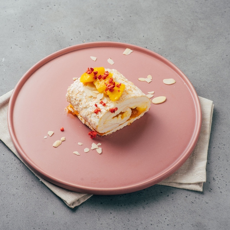 Рулет белковый, сыр творожный, сливки, сахар, пюре маракуйя, манго, лепестки миндаля, ягода сублимированная.