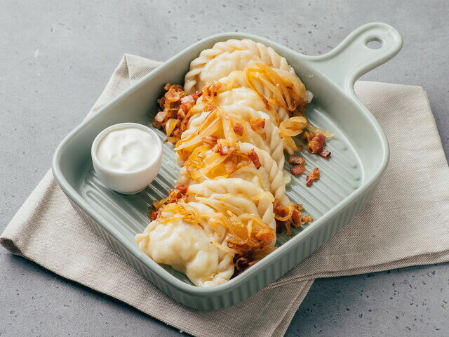Вареники с картофелем, лук репчатый, бекон сырокопчёный, сметана.