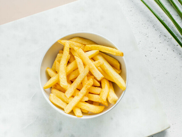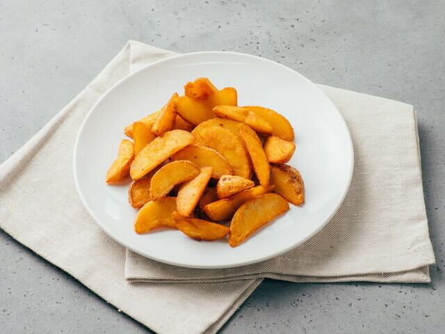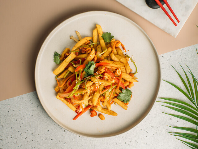 Картофель фри, перец болгарский, лук, морковь, кинза, арахис чили.