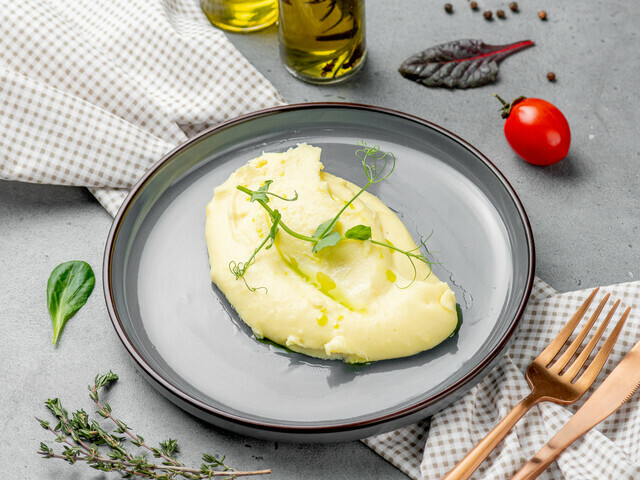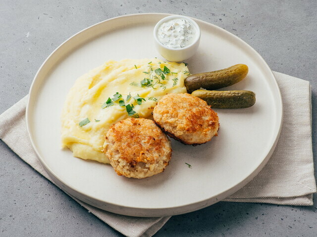 Фарш из щуки, картофельное пюре, корнишоны консервированные, сливочный соус.