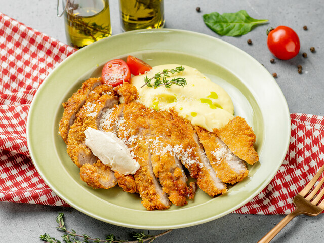 Отбивная из свинины в сухарях, картофельное пюре, соус "Пармезан".