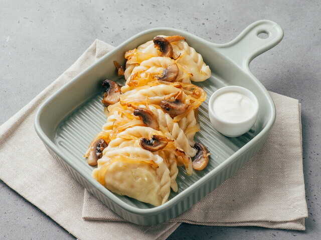Вареники с картофелем, лук репчатый, шампиньоны, сметана.