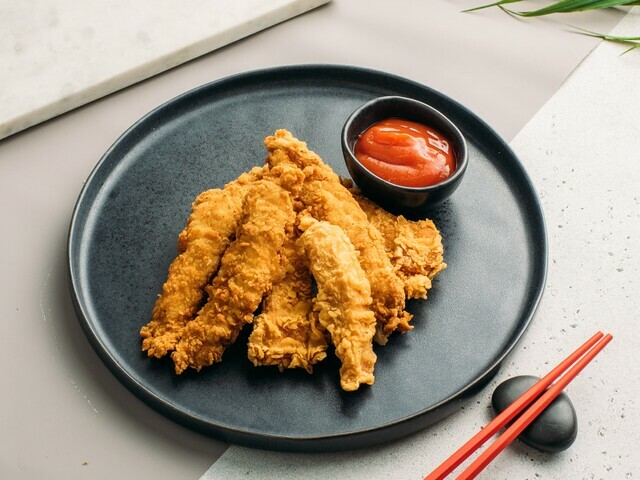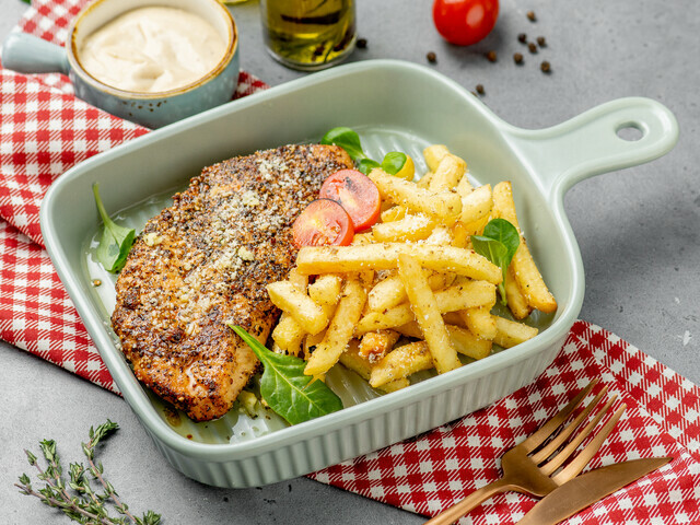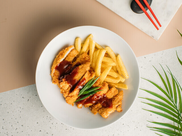 Отбивная мз курицы, картофель фри, соус "Тонкацу" с перцем чили.
