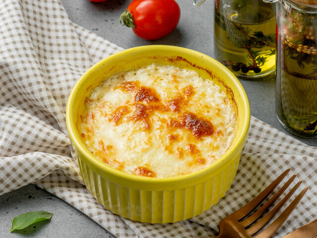 Индейка, грибы, сыр моцарелла, лук, сливки, специи.