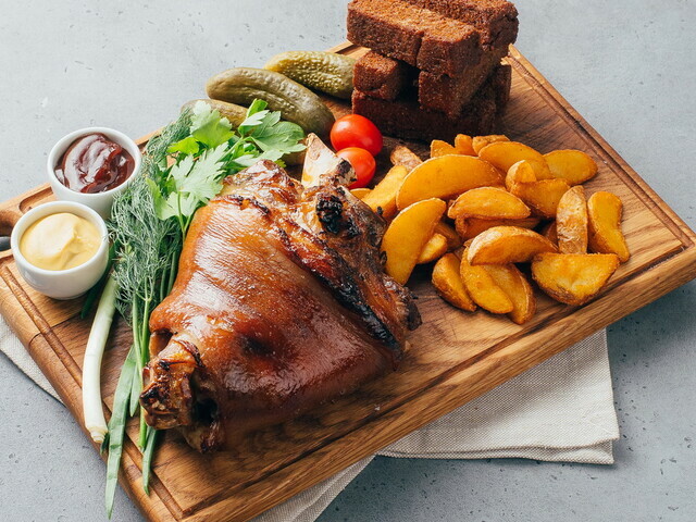Рулька свиная, картофельные дольки, корнишоны маринованные, гренки чесночные, зелень, томаты черри, горчица, соус "Барбекю".