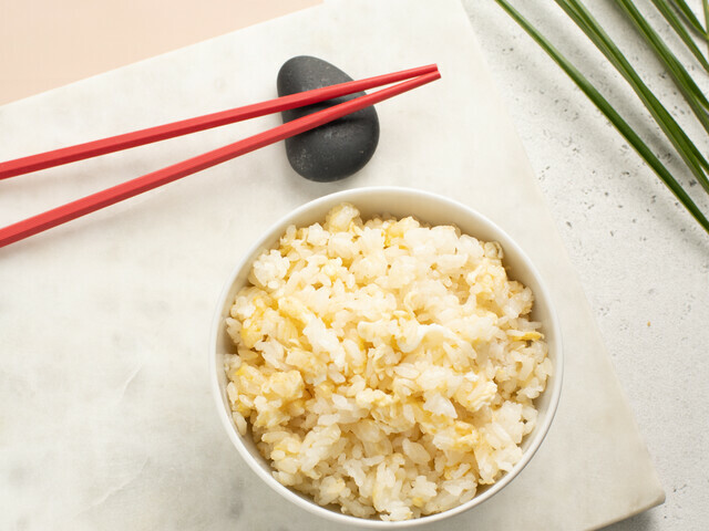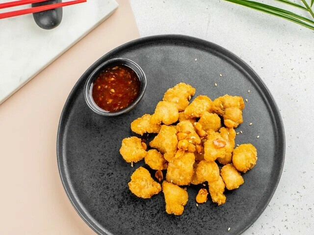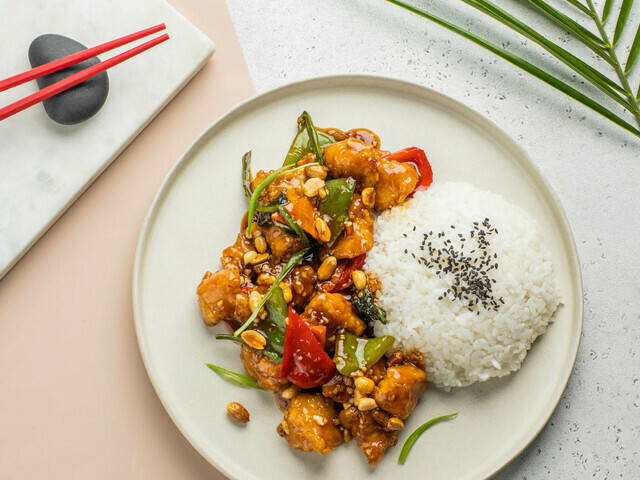 Куриное филе, рис, морковь, перец болгарский, папоротник, яйцо куриное, суос "Кунг пао", арахис чили, кунжут.