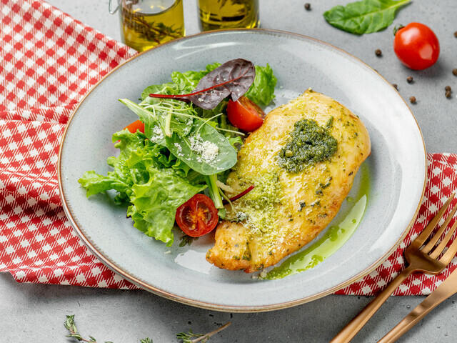 Стейк куриной грудки, микс зелени, соус "Песто"