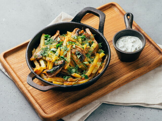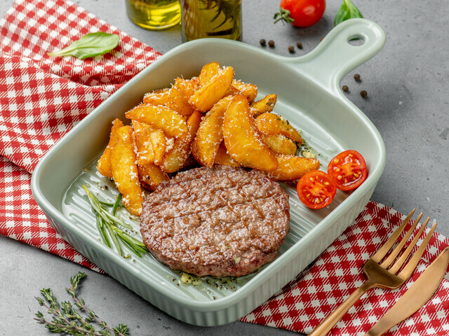 Бифштекс, картофельные дольки, сыр "Пармезан", трюфельное масло.