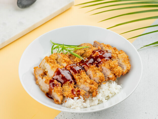 Отбивная из свинины, рис паровой, соус "Тонкацу" с перцем чили.