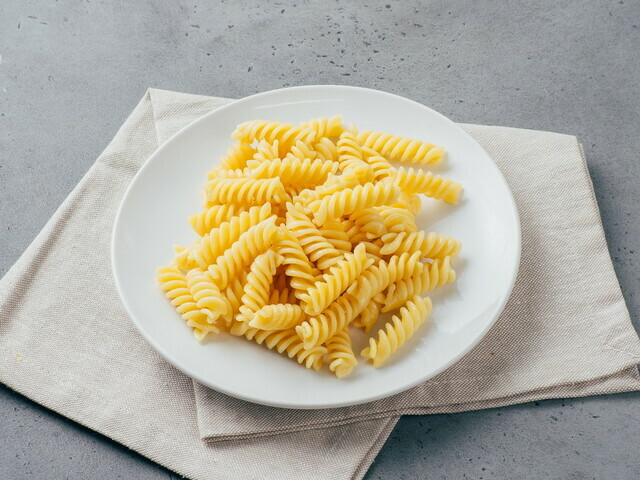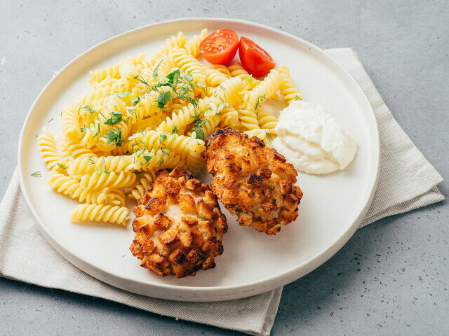 Котлета куриная, сухари тостовые, макароны, соус "Пармезан", томаты черри, зелень.