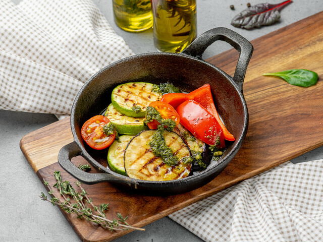 Баклажан, цукини, томаты черри, болгарский перец, томаты черри, соус "Песто", сыр "Пармезан".