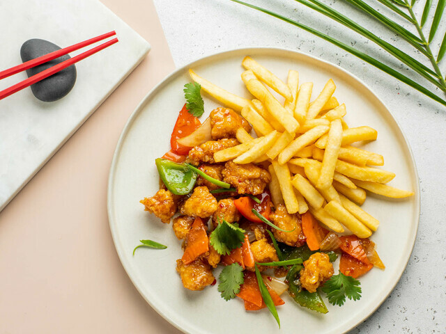 Куриное филе, лук репчатый, морковь, перец болгарский, лук зеленый, яйцо куриное, соус вок, картофель фри
