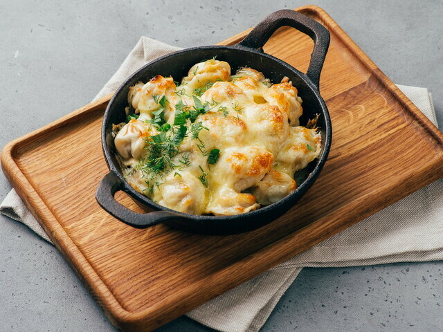 Пельмени с говядиной, сыр "Моцарелла", масло сливочное, зелень.