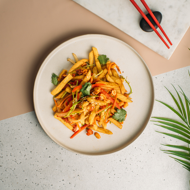 Картофель фри, перец болгарский, лук, морковь, кинза, арахис чили.