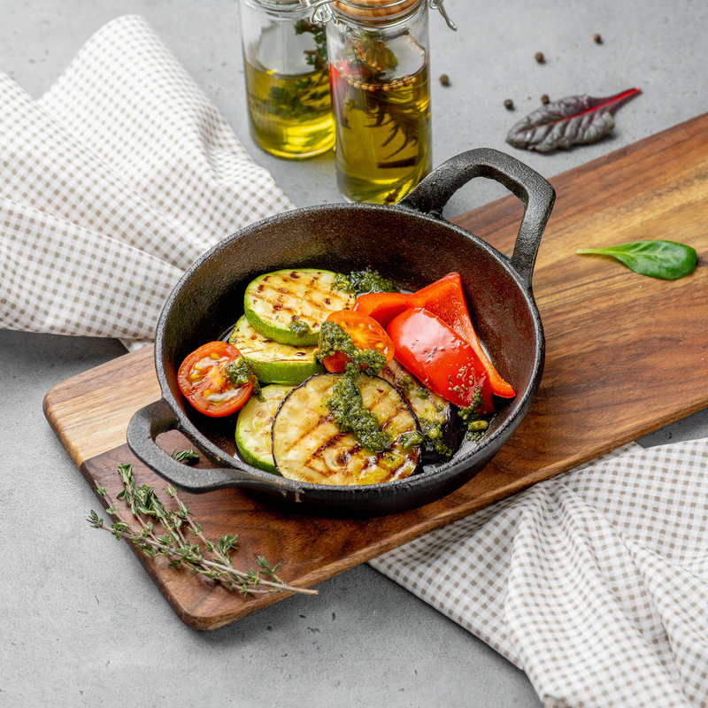 Баклажан, цукини, томаты черри, болгарский перец, томаты черри, соус "Песто", сыр "Пармезан".