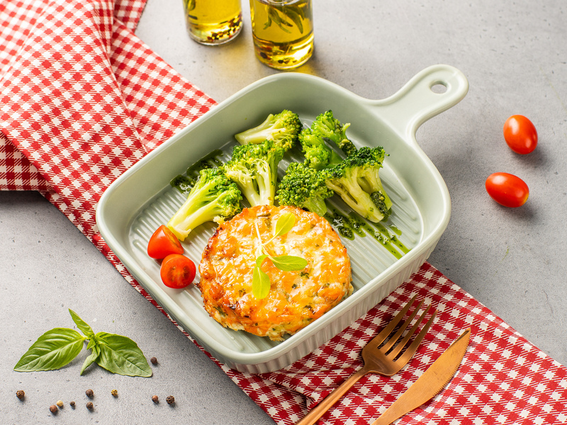 Лосось, брокколи, сыр, лук зелёный, черри, соус песто