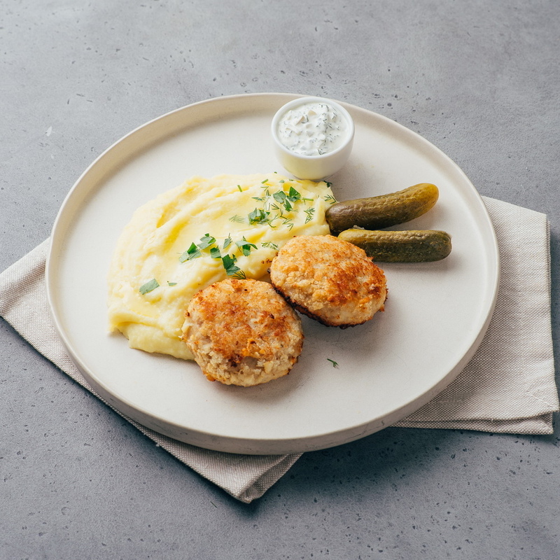 Фарш из щуки, картофельное пюре, корнишоны консервированные, сливочный соус.