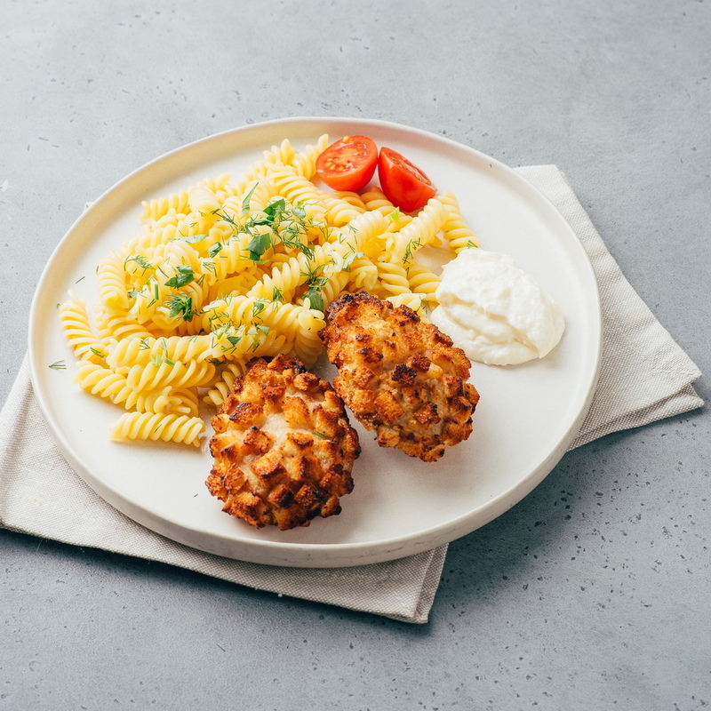 Котлета куриная, сухари тостовые, макароны, соус "Пармезан", томаты черри, зелень.