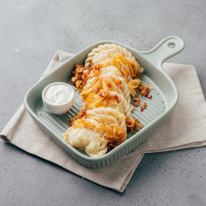 Вареники с картофелем, лук репчатый, бекон сырокопчёный, сметана.