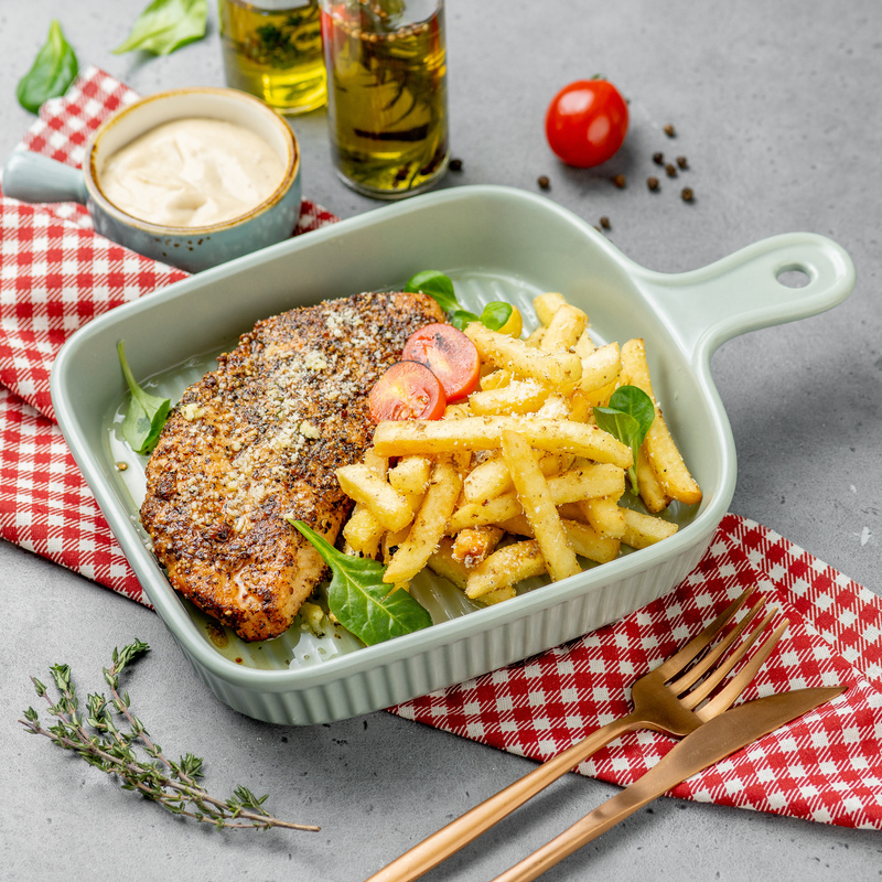 Стейк индейки, перец чёрный, картофель фри, трюфельная паста, томаты черри.