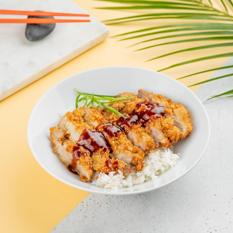 Отбивная из свинины, рис паровой, соус "Тонкацу" с перцем чили.