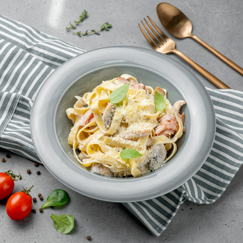 Феттучини, филе цыплёнка, ветчина, шампиньоны, трюфельная паста, сыр "Пармезан", чесночное масло, лук.