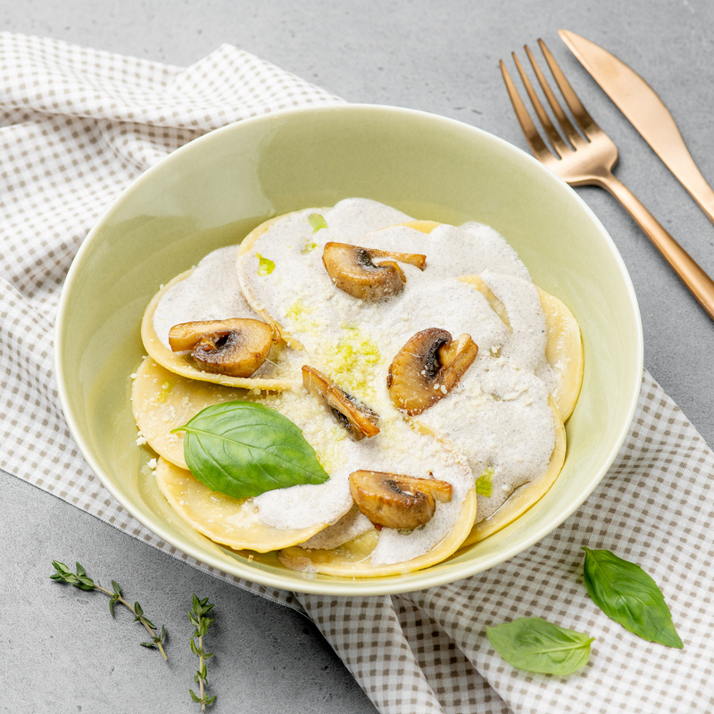 Индейка, шампиньоны, сыр "Пармезан", трюфельная паста, сливки, лук.