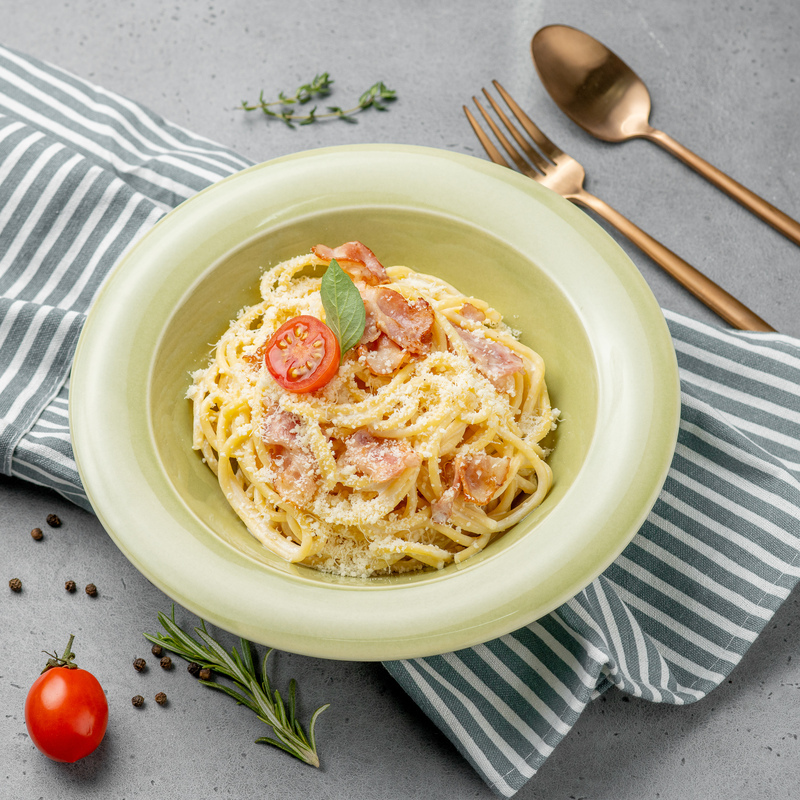 Спагетти, бекон, сливки, соус "Деми Глас", соус "Бешамель", томаты черри, сыр "Пармезан".