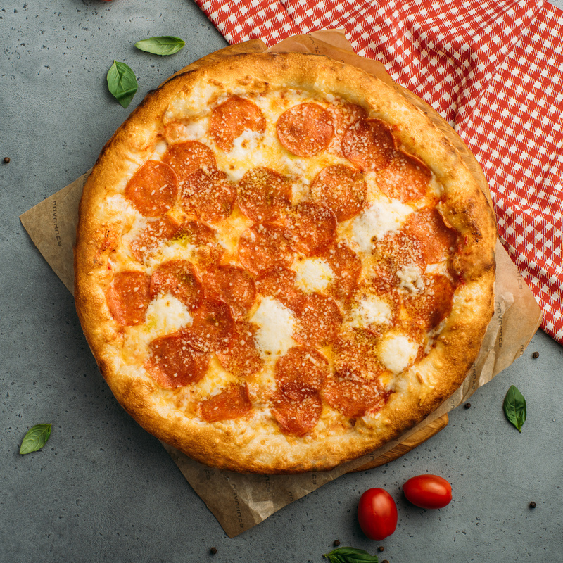 Пепперони, моцарелла, маскарпоне, пармезан, томатный соус.