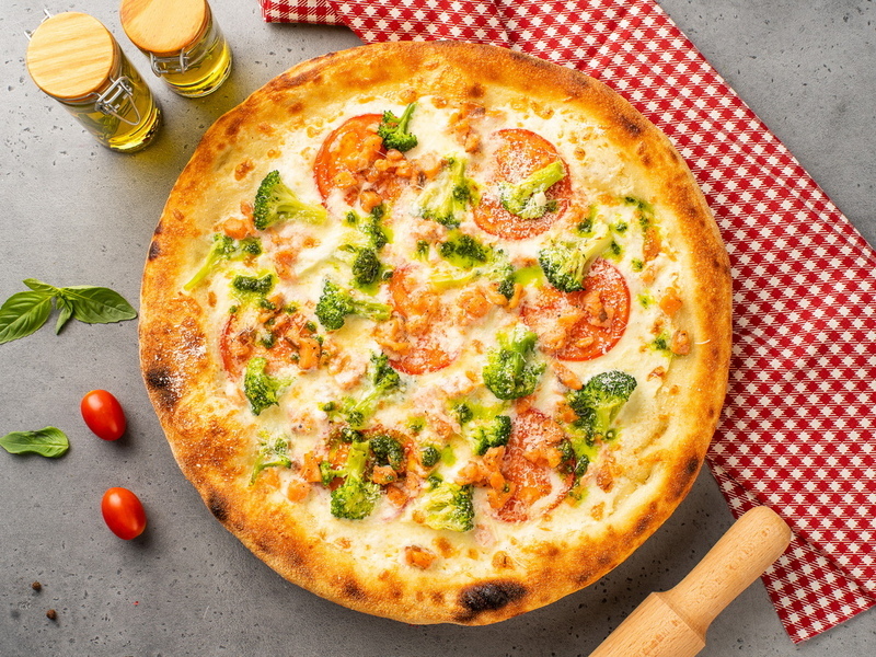 Лосось, брокколи, помидоры свежие, сыр Пармезан, соус чесночно - сливочный.
