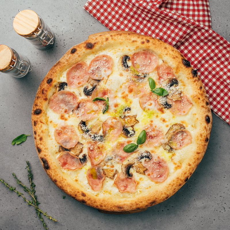 Ветчина, шампиньоны, сыр Пармезан, соус чесночно - сливочный.