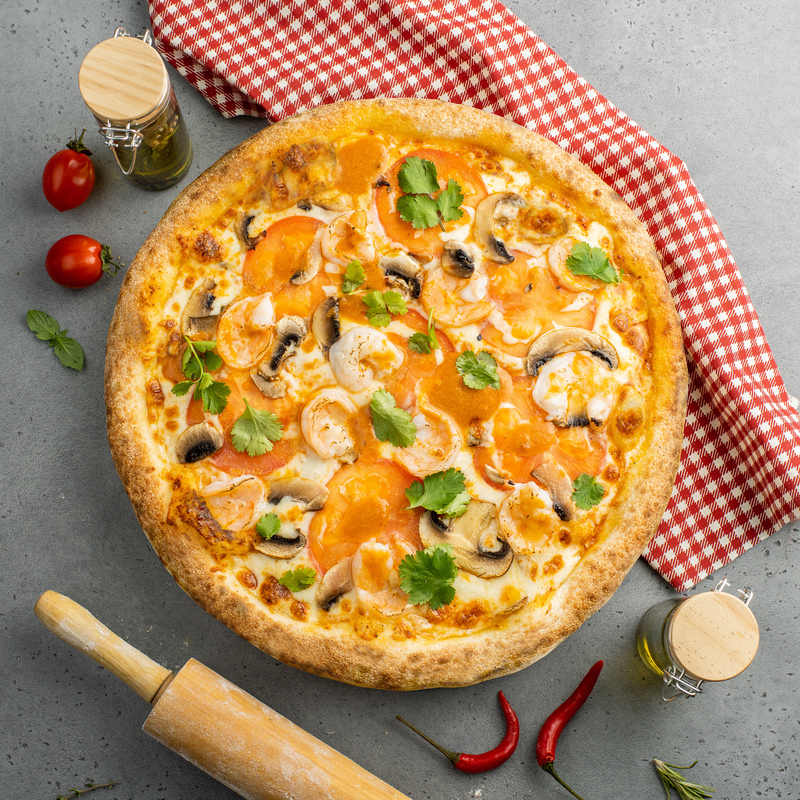 Креветки, тайский соус, томаты, шампиньоны, моцарелла, кинза.