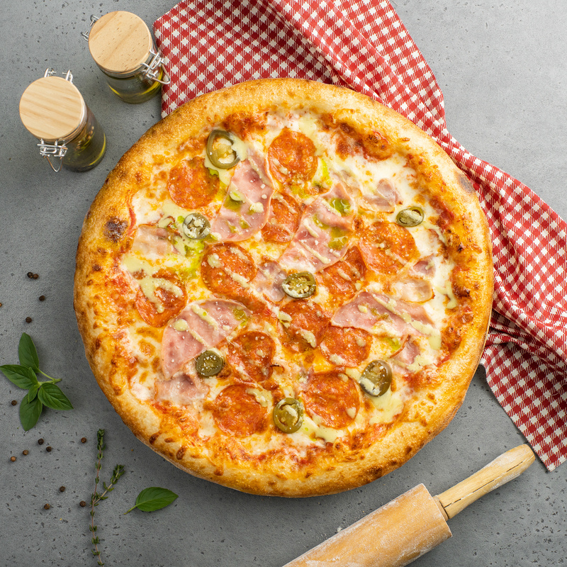 Ветчина, бекон, перец халапенью, моцарела, пармезан, соус халапеньо.