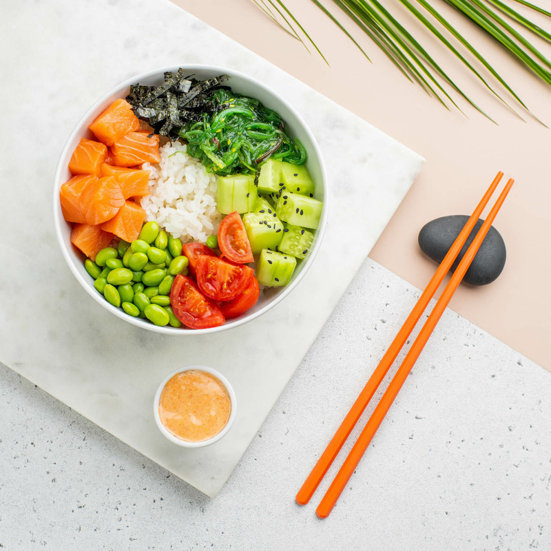 Рис, лосось, огурец, томаты черри, бобы эдамаме, салат чука, соус спайси, кунжут.