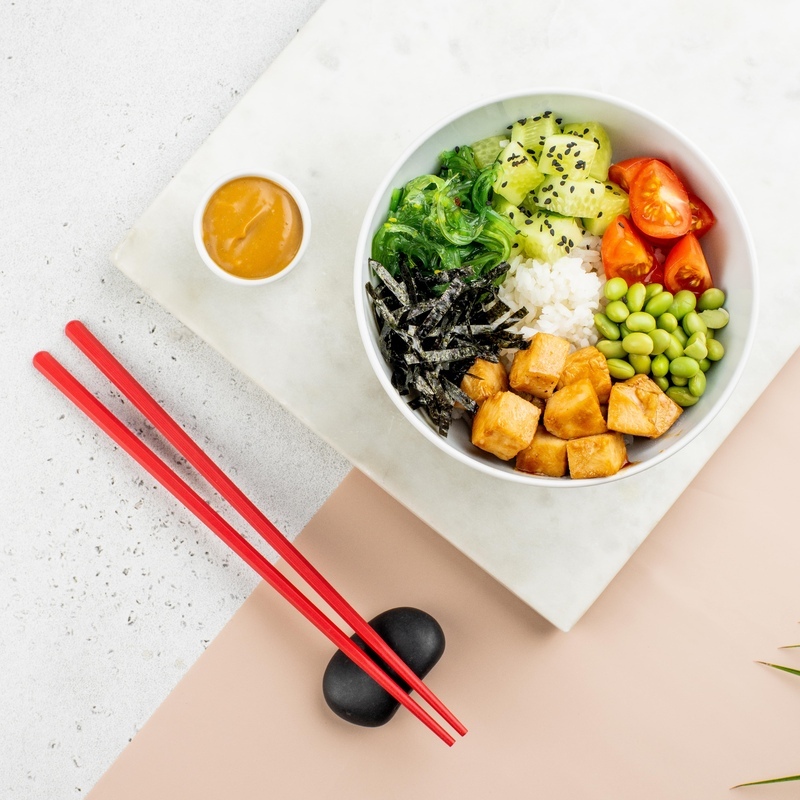 Рис, курочка терияки, огурец, томаты черри, бобы эдамаме, салат чука, соус терияки, кунжут.