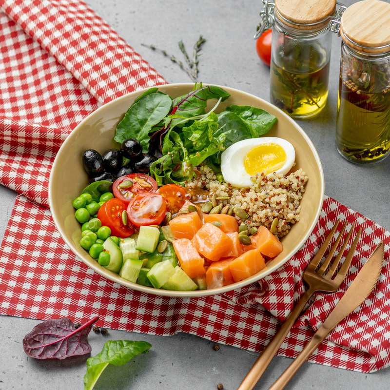 Слабосолёный лосось, киноа, .маслины, яйцо, томаты черри, микс зелени, зелёный горошек, свежий огурец, киноа поп, заправка бальзамический.