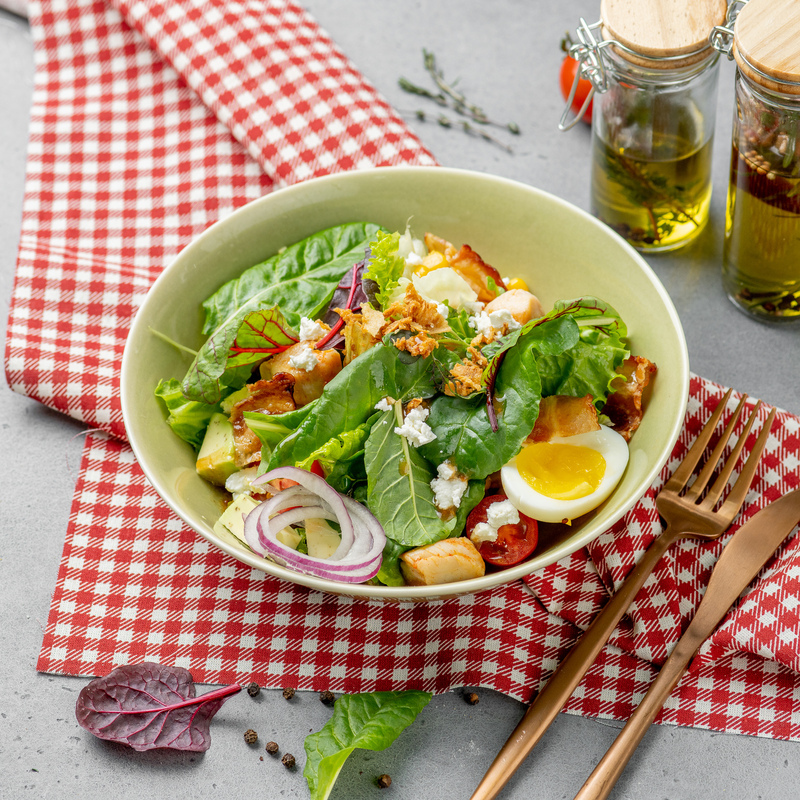 Микс зелени, запечённое филе цыплёнка, огурец, сыр фета, хрустящий бекон, яйцо, редис, лук красный, кукуруза, луковый кранч, заправка бальзамическая.