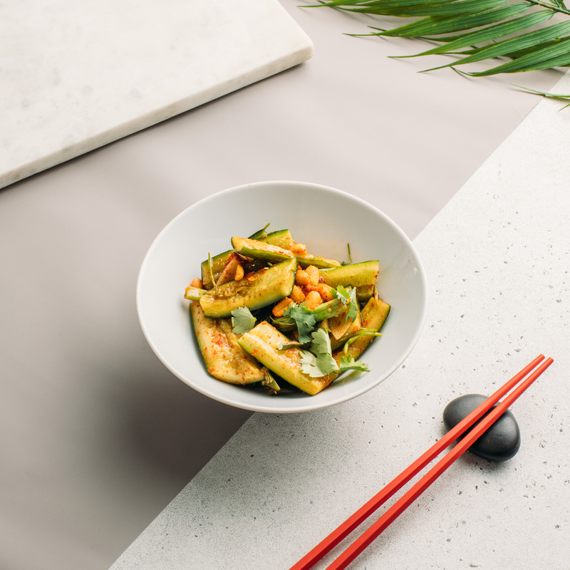 Огурцы, чеснок, пряно-сладкий маринад кочукаро, арахис чили, кинза