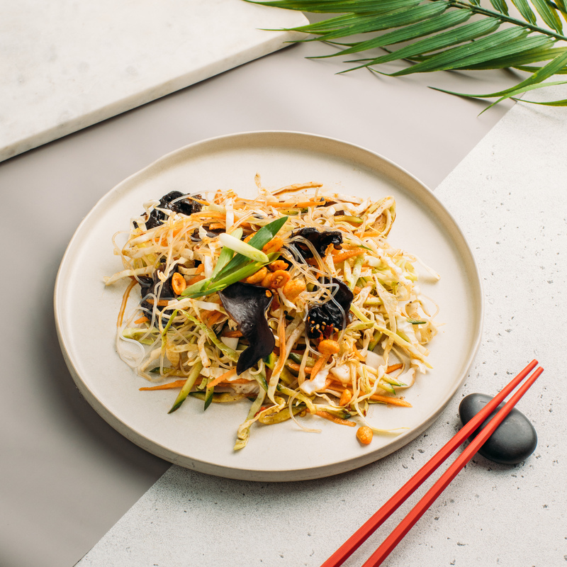Фунчоза, огурец свежий, капуста, морковь, грибы древесные, кинза, арахис чили, заправка.