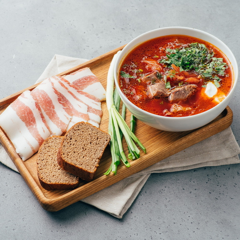 Картофель, капуста белокочанная, морковь, свекла, говядина, хлеб бородинский, сало, сметана, зелень.