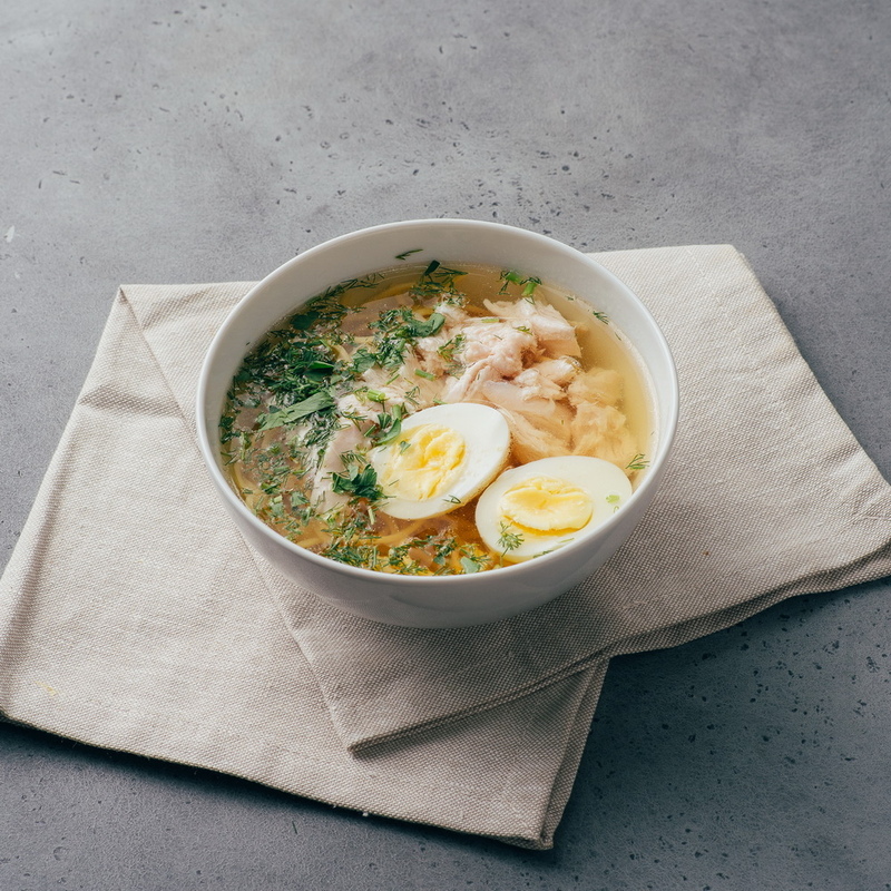 Филе куриное, лапша, яйцо, зелень.