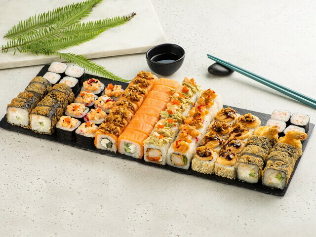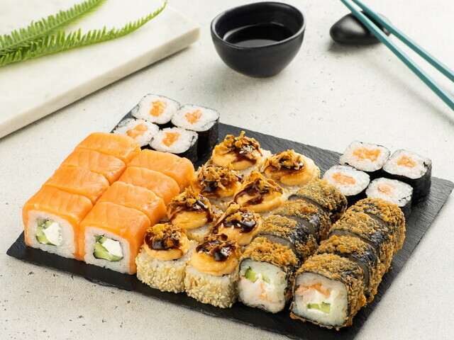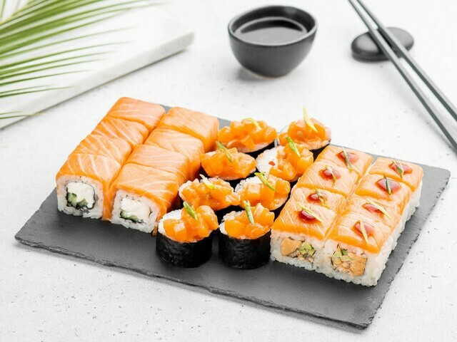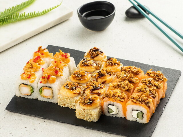 Нежная филадельфия с лососем, запечённый ролл с лососем - шапка Пармезан, темпура с лососем и креветкой, сяке маки.