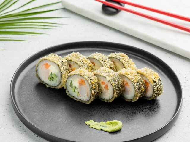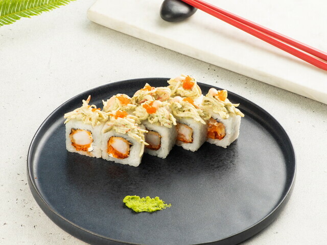 Рис, нори, креветка, сыр сливочный, икра масаго, огурец, соус спайси, соус васаби, луковый кранч.