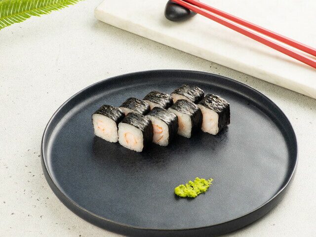 Рис, нори, креветки, огурец, сыр сливочный, соус унаги.
