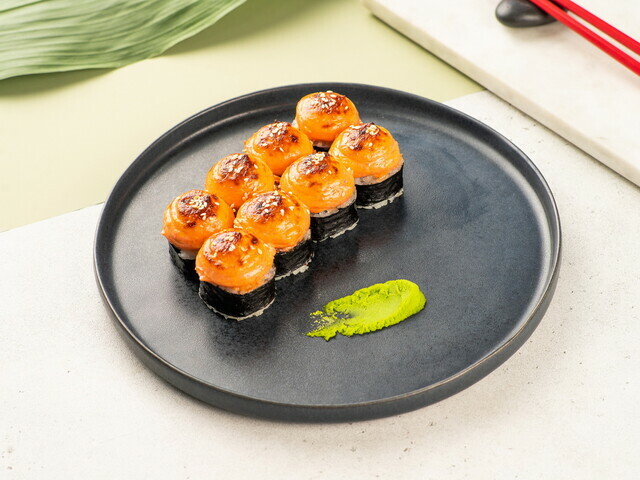 Особый с лососем, запечённый ролл с лососем - шапка Пармезан, филадельфия криспи.