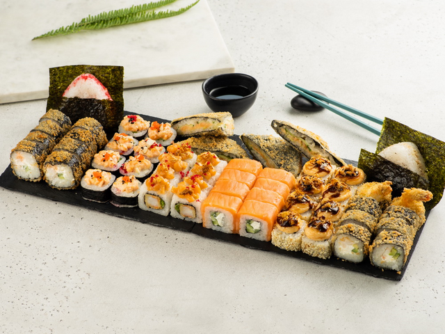 Темпура с лососем и креветкой, запечённый ролл слососем и чесночным крабом, особый с лососем, нежная филадельфия с лососем, запечённый с лососем - шапка Пармезан, темпура "Динамит", онигири лосось с соусом спайси, онигири с курицей терияки, сендвич ролл с курицей, сендвич ролл с лососем.